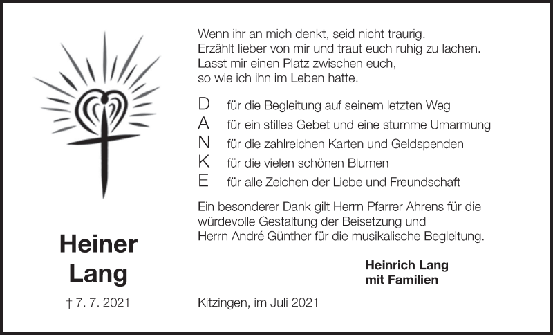 Hier finden Sie alle Traueranzeigen aus der Zeitung, die bisher für Heiner Lang erschienen sind. Weitere Traueranzeigen, die in der Zeitung erscheinen, werden hier ebenfalls aufgelistet