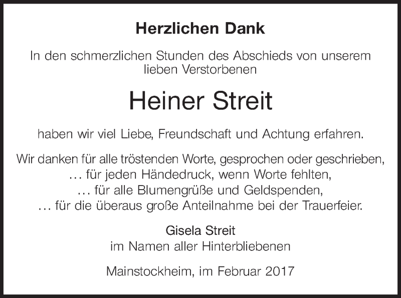 Hier finden Sie alle Traueranzeigen aus der Zeitung, die bisher für Heiner Streit erschienen sind. Weitere Traueranzeigen, die in der Zeitung erscheinen, werden hier ebenfalls aufgelistet