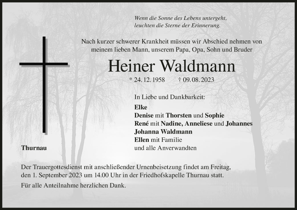 Hier finden Sie alle Traueranzeigen aus der Zeitung, die bisher für Heiner Waldmann erschienen sind. Weitere Traueranzeigen, die in der Zeitung erscheinen, werden hier ebenfalls aufgelistet