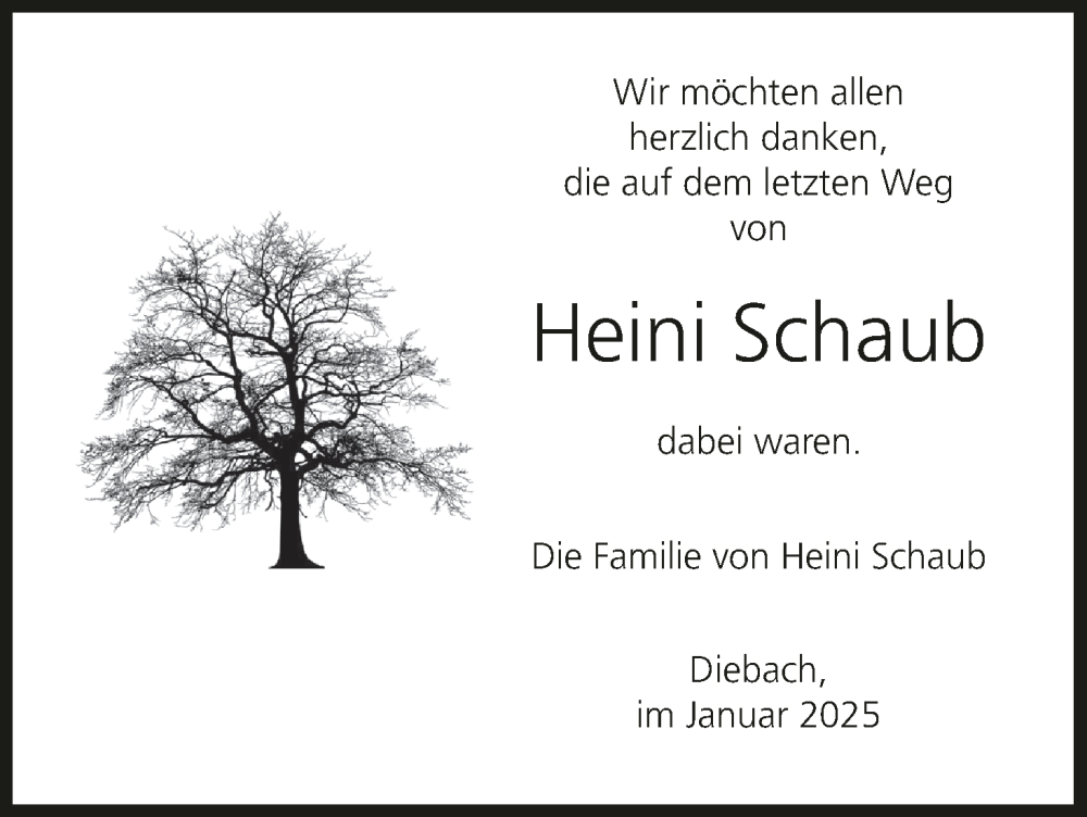 Hier finden Sie alle Traueranzeigen aus der Zeitung, die bisher für Heini Schaub erschienen sind. Weitere Traueranzeigen, die in der Zeitung erscheinen, werden hier ebenfalls aufgelistet