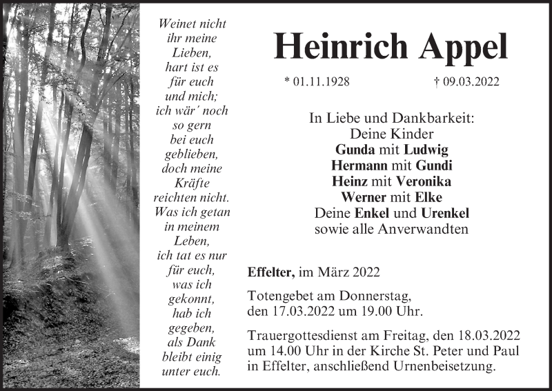 Hier finden Sie alle Traueranzeigen aus der Zeitung, die bisher für Heinrich Appel erschienen sind. Weitere Traueranzeigen, die in der Zeitung erscheinen, werden hier ebenfalls aufgelistet