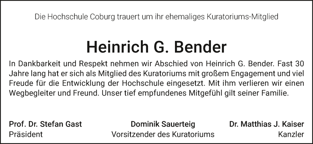 Hier finden Sie alle Traueranzeigen aus der Zeitung, die bisher für Heinrich G. Bender erschienen sind. Weitere Traueranzeigen, die in der Zeitung erscheinen, werden hier ebenfalls aufgelistet