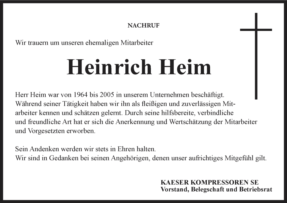 Hier finden Sie alle Traueranzeigen aus der Zeitung, die bisher für Heinrich Heim erschienen sind. Weitere Traueranzeigen, die in der Zeitung erscheinen, werden hier ebenfalls aufgelistet