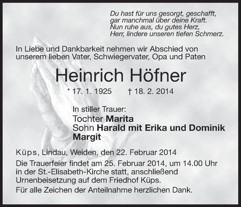 Hier finden Sie alle Traueranzeigen aus der Zeitung, die bisher für Heinrich Höfner erschienen sind. Weitere Traueranzeigen, die in der Zeitung erscheinen, werden hier ebenfalls aufgelistet