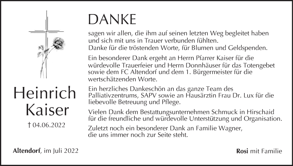 Hier finden Sie alle Traueranzeigen aus der Zeitung, die bisher für Heinrich Kaiser erschienen sind. Weitere Traueranzeigen, die in der Zeitung erscheinen, werden hier ebenfalls aufgelistet
