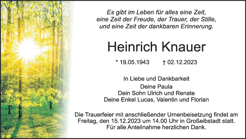 Hier finden Sie alle Traueranzeigen aus der Zeitung, die bisher für Heinrich Knauer erschienen sind. Weitere Traueranzeigen, die in der Zeitung erscheinen, werden hier ebenfalls aufgelistet