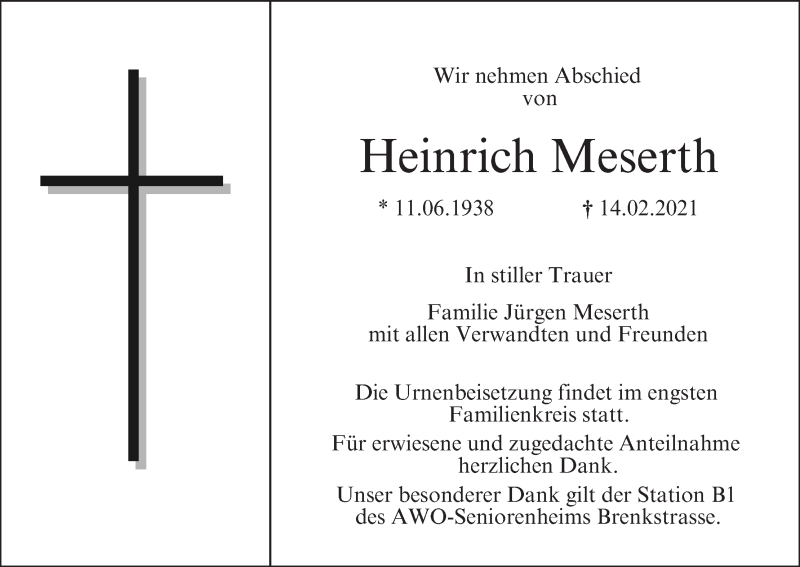 Hier finden Sie alle Traueranzeigen aus der Zeitung, die bisher für Heinrich Meserth erschienen sind. Weitere Traueranzeigen, die in der Zeitung erscheinen, werden hier ebenfalls aufgelistet