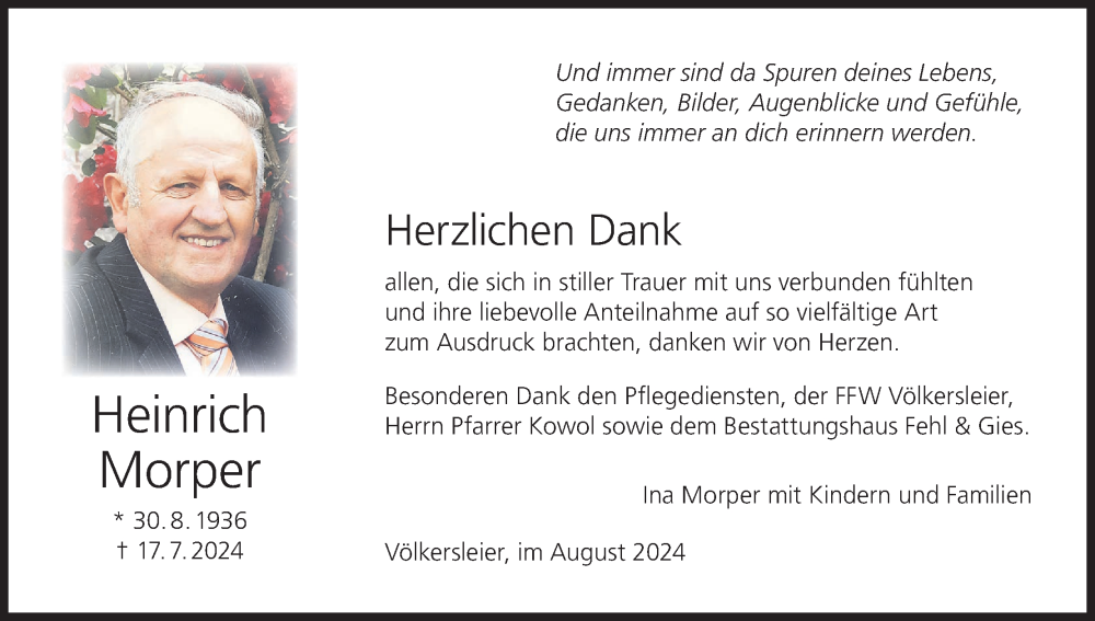Hier finden Sie alle Traueranzeigen aus der Zeitung, die bisher für Heinrich Morper erschienen sind. Weitere Traueranzeigen, die in der Zeitung erscheinen, werden hier ebenfalls aufgelistet
