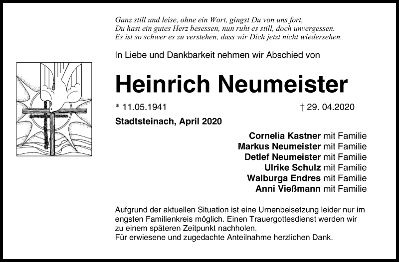 Hier finden Sie alle Traueranzeigen aus der Zeitung, die bisher für Heinrich Neumeister erschienen sind. Weitere Traueranzeigen, die in der Zeitung erscheinen, werden hier ebenfalls aufgelistet