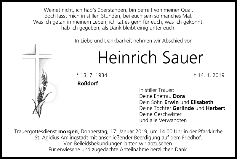 Hier finden Sie alle Traueranzeigen aus der Zeitung, die bisher für Heinrich Sauer erschienen sind. Weitere Traueranzeigen, die in der Zeitung erscheinen, werden hier ebenfalls aufgelistet
