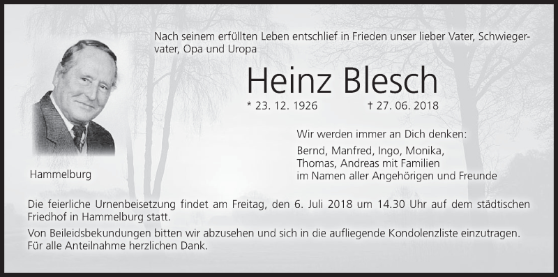 Hier finden Sie alle Traueranzeigen aus der Zeitung, die bisher für Heinz Blesch erschienen sind. Weitere Traueranzeigen, die in der Zeitung erscheinen, werden hier ebenfalls aufgelistet