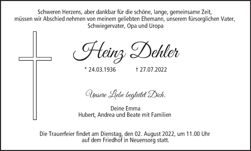 Hier finden Sie alle Traueranzeigen aus der Zeitung, die bisher für Heinz Dehler erschienen sind. Weitere Traueranzeigen, die in der Zeitung erscheinen, werden hier ebenfalls aufgelistet