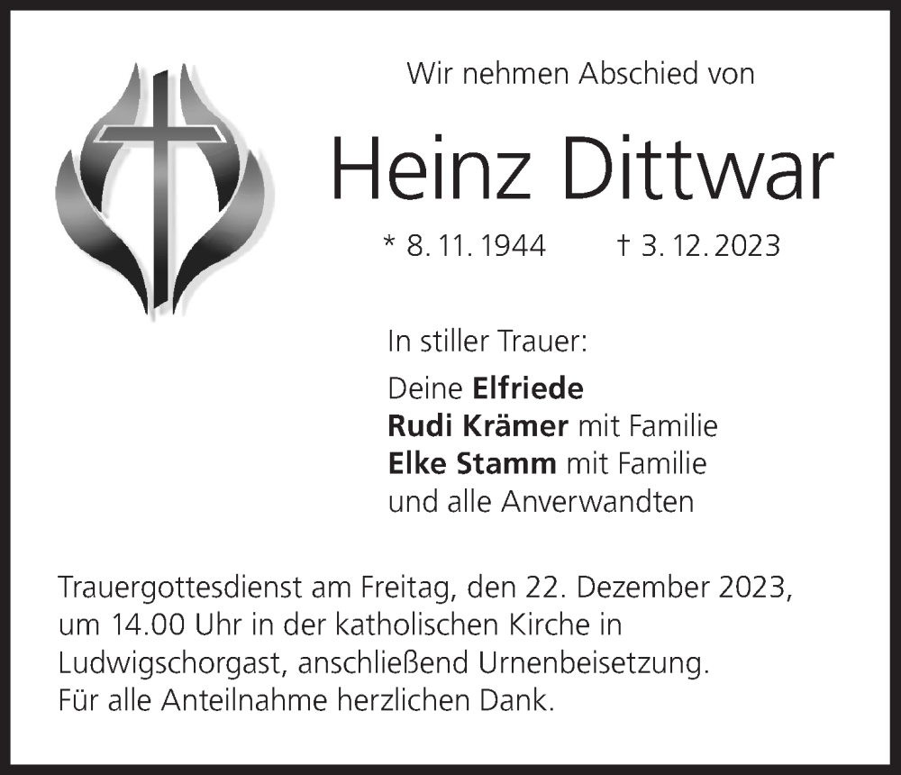 Hier finden Sie alle Traueranzeigen aus der Zeitung, die bisher für Heinz Dittwar erschienen sind. Weitere Traueranzeigen, die in der Zeitung erscheinen, werden hier ebenfalls aufgelistet