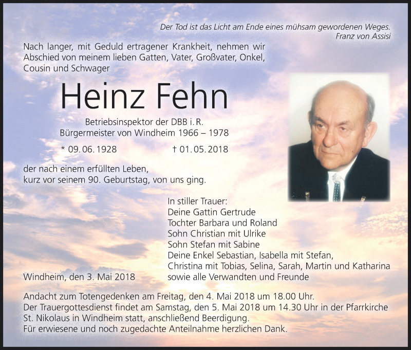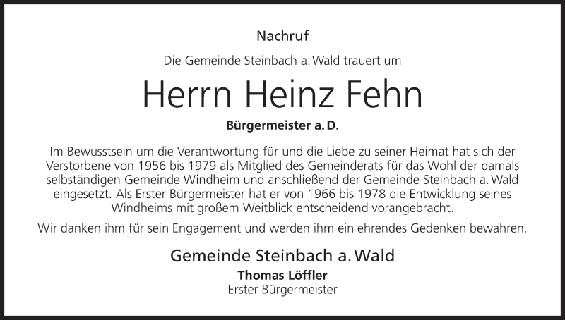 Hier finden Sie alle Traueranzeigen aus der Zeitung, die bisher für Heinz Fehn erschienen sind. Weitere Traueranzeigen, die in der Zeitung erscheinen, werden hier ebenfalls aufgelistet