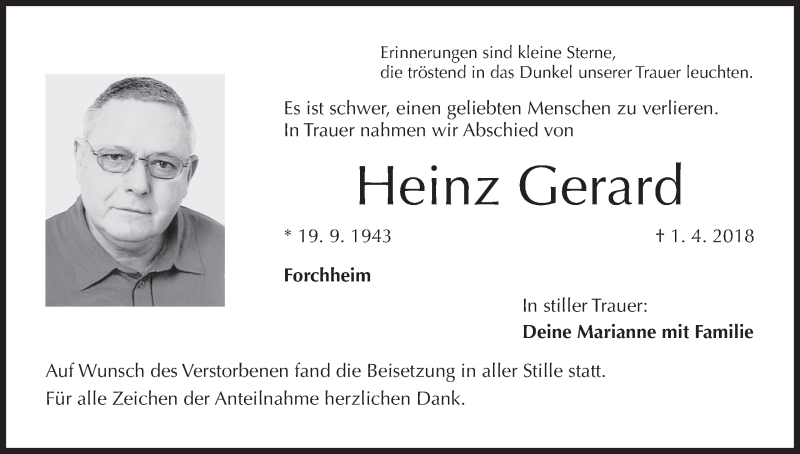 Hier finden Sie alle Traueranzeigen aus der Zeitung, die bisher für Heinz Gerard erschienen sind. Weitere Traueranzeigen, die in der Zeitung erscheinen, werden hier ebenfalls aufgelistet