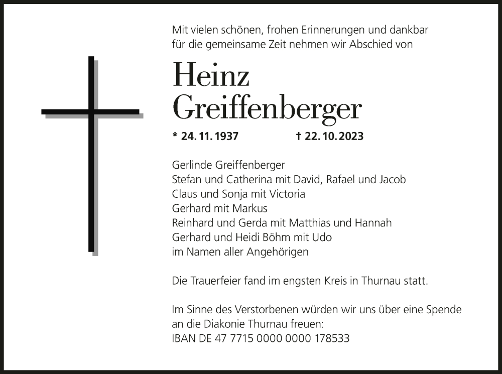 Hier finden Sie alle Traueranzeigen aus der Zeitung, die bisher für Heinz Greiffenberger erschienen sind. Weitere Traueranzeigen, die in der Zeitung erscheinen, werden hier ebenfalls aufgelistet