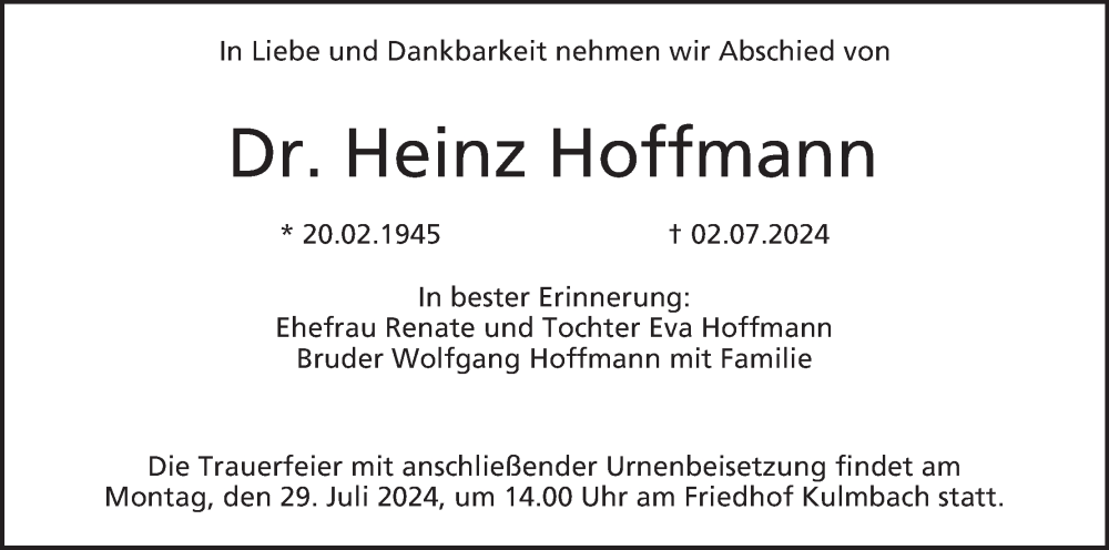 Hier finden Sie alle Traueranzeigen aus der Zeitung, die bisher für Heinz Hoffmann erschienen sind. Weitere Traueranzeigen, die in der Zeitung erscheinen, werden hier ebenfalls aufgelistet