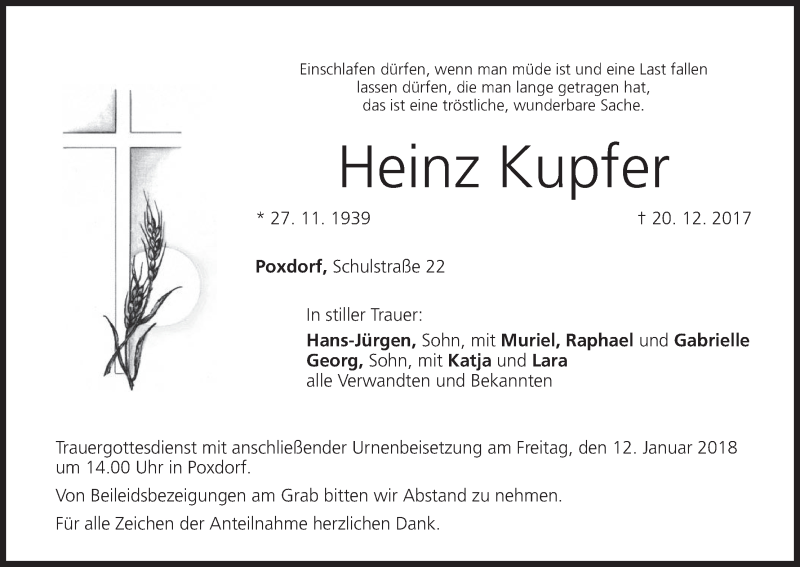 Hier finden Sie alle Traueranzeigen aus der Zeitung, die bisher für Heinz Kupfer erschienen sind. Weitere Traueranzeigen, die in der Zeitung erscheinen, werden hier ebenfalls aufgelistet