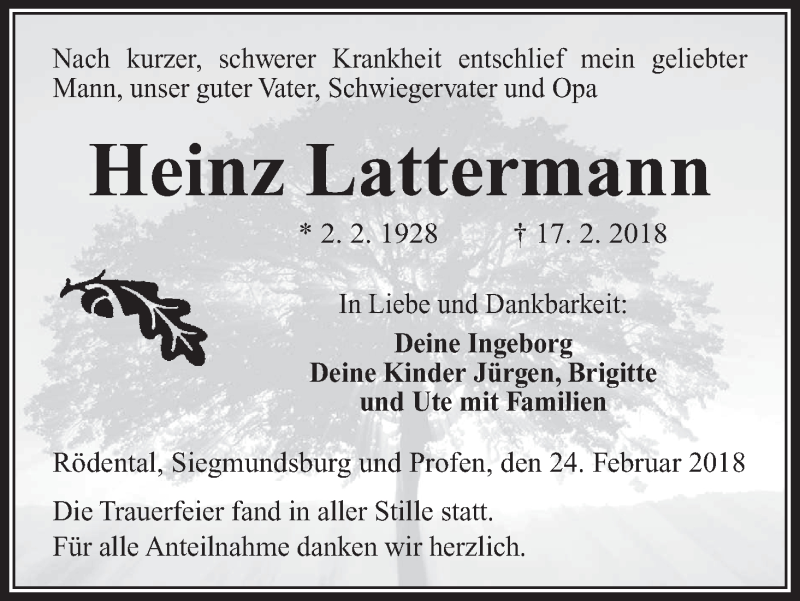 Hier finden Sie alle Traueranzeigen aus der Zeitung, die bisher für Heinz Lattermann erschienen sind. Weitere Traueranzeigen, die in der Zeitung erscheinen, werden hier ebenfalls aufgelistet