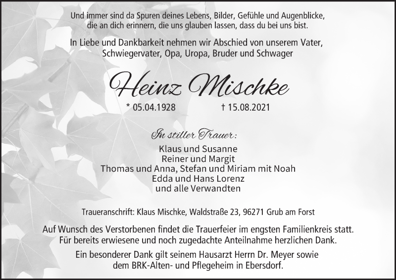 Hier finden Sie alle Traueranzeigen aus der Zeitung, die bisher für Heinz Mischke erschienen sind. Weitere Traueranzeigen, die in der Zeitung erscheinen, werden hier ebenfalls aufgelistet