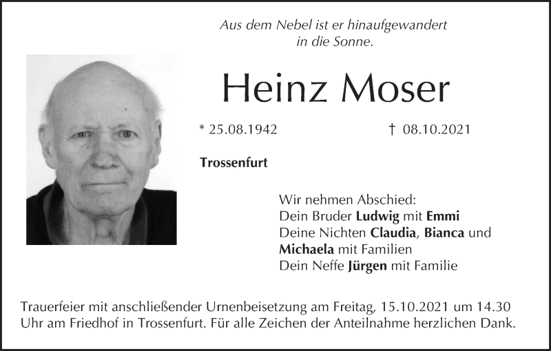Hier finden Sie alle Traueranzeigen aus der Zeitung, die bisher für Heinz Moser erschienen sind. Weitere Traueranzeigen, die in der Zeitung erscheinen, werden hier ebenfalls aufgelistet