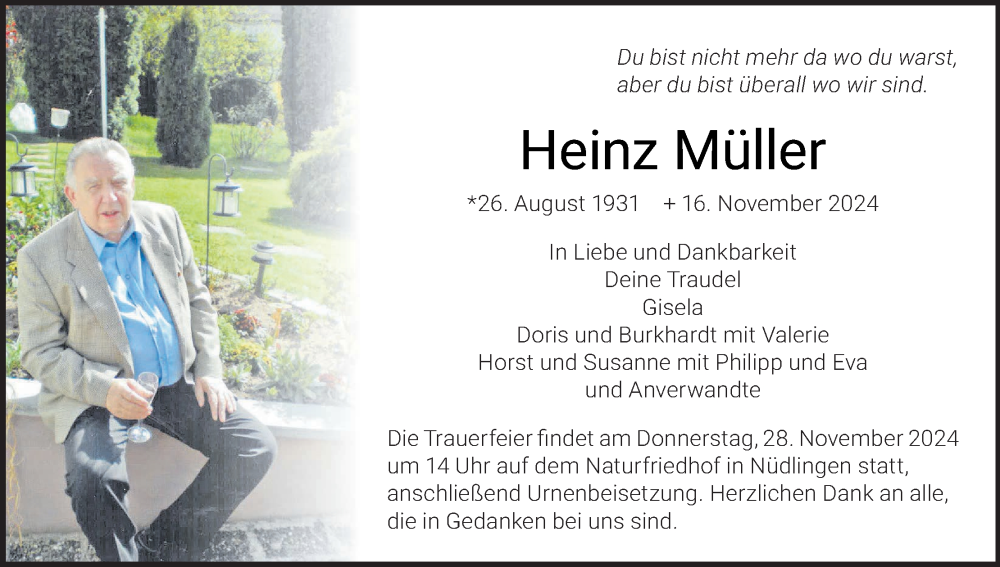 Hier finden Sie alle Traueranzeigen aus der Zeitung, die bisher für Heinz Müller erschienen sind. Weitere Traueranzeigen, die in der Zeitung erscheinen, werden hier ebenfalls aufgelistet