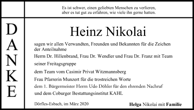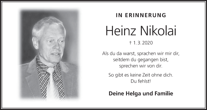Hier finden Sie alle Traueranzeigen aus der Zeitung, die bisher für Heinz Nikolai erschienen sind. Weitere Traueranzeigen, die in der Zeitung erscheinen, werden hier ebenfalls aufgelistet