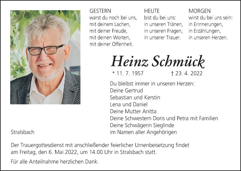 Hier finden Sie alle Traueranzeigen aus der Zeitung, die bisher für Heinz Schmück erschienen sind. Weitere Traueranzeigen, die in der Zeitung erscheinen, werden hier ebenfalls aufgelistet