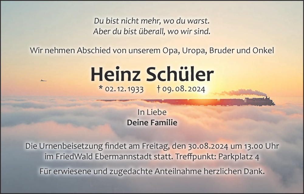 Hier finden Sie alle Traueranzeigen aus der Zeitung, die bisher für Heinz Schüler erschienen sind. Weitere Traueranzeigen, die in der Zeitung erscheinen, werden hier ebenfalls aufgelistet