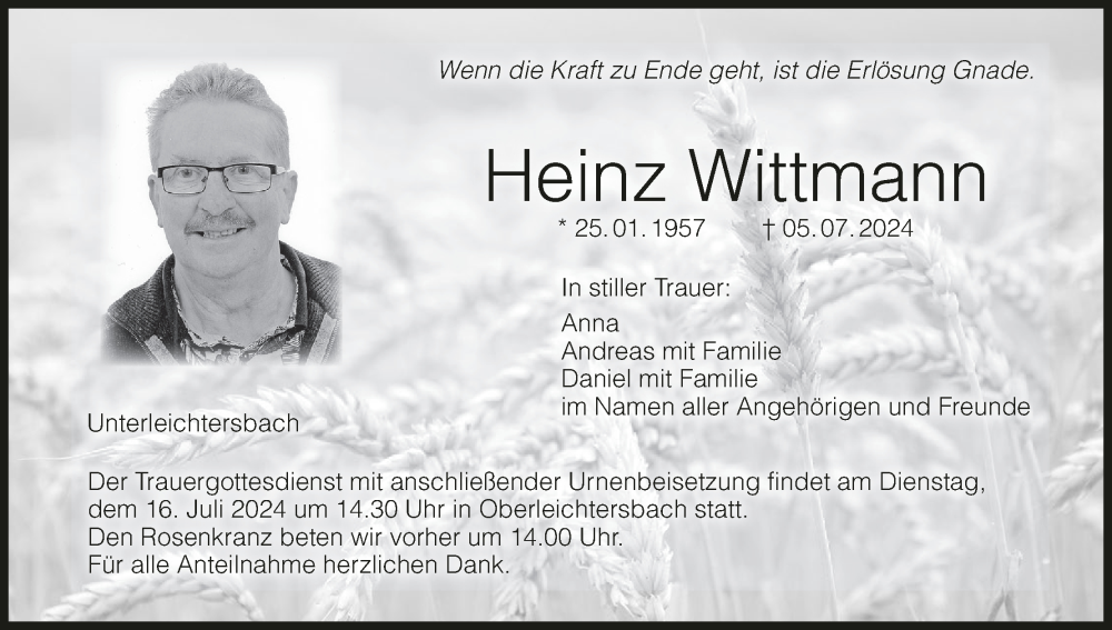 Hier finden Sie alle Traueranzeigen aus der Zeitung, die bisher für Heinz Wittmann erschienen sind. Weitere Traueranzeigen, die in der Zeitung erscheinen, werden hier ebenfalls aufgelistet