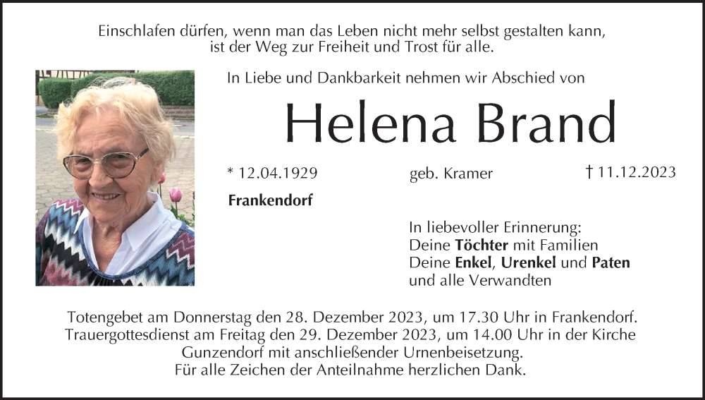 Hier finden Sie alle Traueranzeigen aus der Zeitung, die bisher für Helena Brand erschienen sind. Weitere Traueranzeigen, die in der Zeitung erscheinen, werden hier ebenfalls aufgelistet