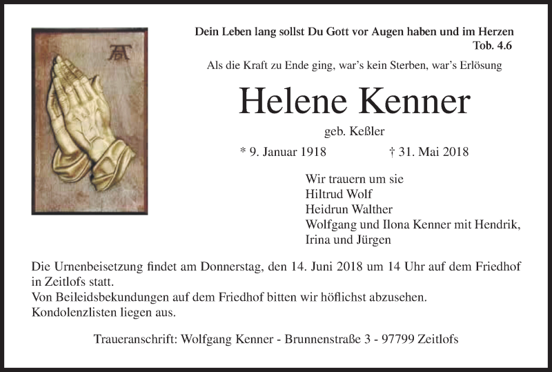 Hier finden Sie alle Traueranzeigen aus der Zeitung, die bisher für Helene Kenner erschienen sind. Weitere Traueranzeigen, die in der Zeitung erscheinen, werden hier ebenfalls aufgelistet