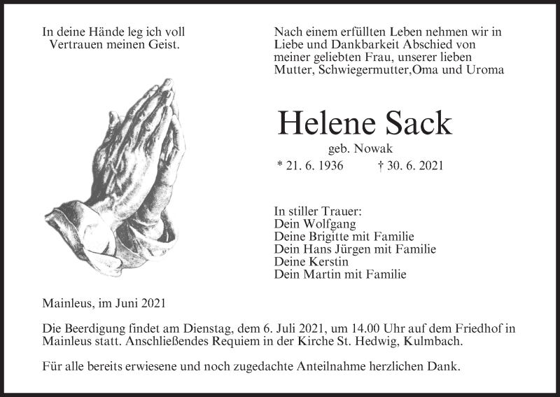 Hier finden Sie alle Traueranzeigen aus der Zeitung, die bisher für Helene Sack erschienen sind. Weitere Traueranzeigen, die in der Zeitung erscheinen, werden hier ebenfalls aufgelistet