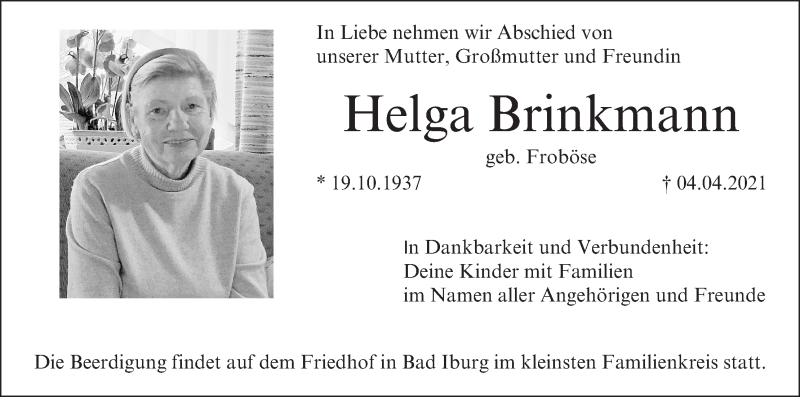 Hier finden Sie alle Traueranzeigen aus der Zeitung, die bisher für Helga Brinkmann erschienen sind. Weitere Traueranzeigen, die in der Zeitung erscheinen, werden hier ebenfalls aufgelistet