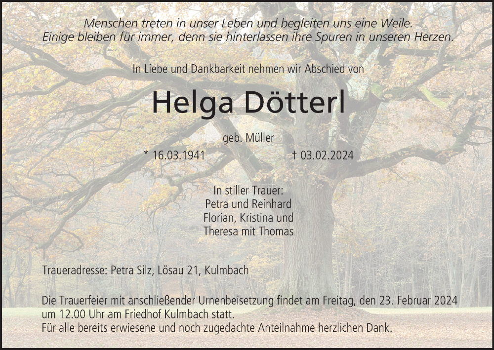 Hier finden Sie alle Traueranzeigen aus der Zeitung, die bisher für Helga Dötterl erschienen sind. Weitere Traueranzeigen, die in der Zeitung erscheinen, werden hier ebenfalls aufgelistet