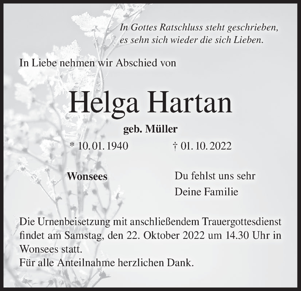 Hier finden Sie alle Traueranzeigen aus der Zeitung, die bisher für Helga Hartan erschienen sind. Weitere Traueranzeigen, die in der Zeitung erscheinen, werden hier ebenfalls aufgelistet