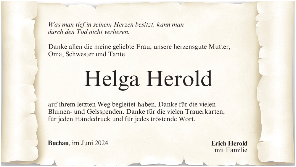 Hier finden Sie alle Traueranzeigen aus der Zeitung, die bisher für Helga Herold erschienen sind. Weitere Traueranzeigen, die in der Zeitung erscheinen, werden hier ebenfalls aufgelistet