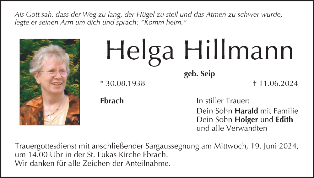 Hier finden Sie alle Traueranzeigen aus der Zeitung, die bisher für Helga Hillmann erschienen sind. Weitere Traueranzeigen, die in der Zeitung erscheinen, werden hier ebenfalls aufgelistet