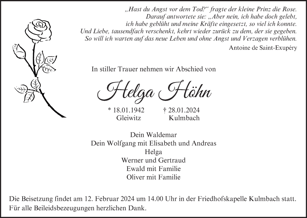 Hier finden Sie alle Traueranzeigen aus der Zeitung, die bisher für Helga Höhn erschienen sind. Weitere Traueranzeigen, die in der Zeitung erscheinen, werden hier ebenfalls aufgelistet