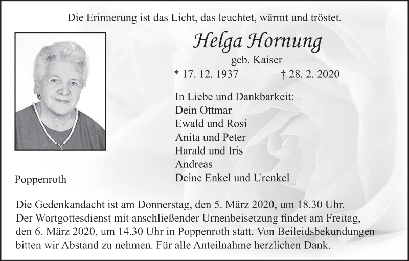 Hier finden Sie alle Traueranzeigen aus der Zeitung, die bisher für Helga Hornung erschienen sind. Weitere Traueranzeigen, die in der Zeitung erscheinen, werden hier ebenfalls aufgelistet