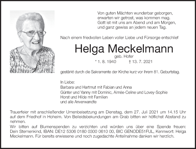 Hier finden Sie alle Traueranzeigen aus der Zeitung, die bisher für Helga Meckelmann erschienen sind. Weitere Traueranzeigen, die in der Zeitung erscheinen, werden hier ebenfalls aufgelistet