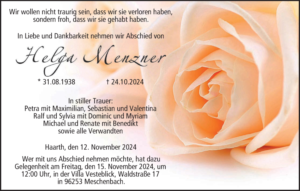 Hier finden Sie alle Traueranzeigen aus der Zeitung, die bisher für Helga Menzner erschienen sind. Weitere Traueranzeigen, die in der Zeitung erscheinen, werden hier ebenfalls aufgelistet