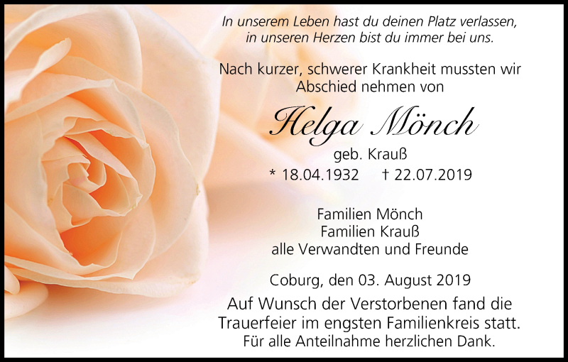Hier finden Sie alle Traueranzeigen aus der Zeitung, die bisher für Helga Mönch erschienen sind. Weitere Traueranzeigen, die in der Zeitung erscheinen, werden hier ebenfalls aufgelistet