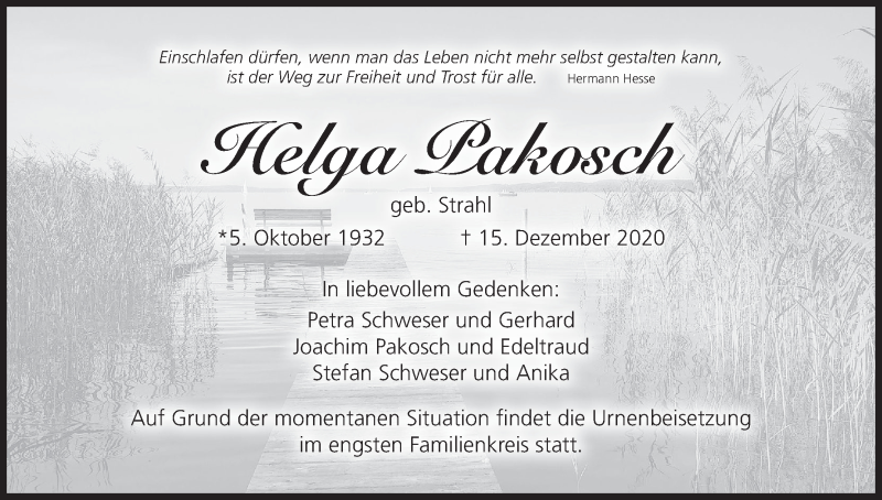 Hier finden Sie alle Traueranzeigen aus der Zeitung, die bisher für Helga Pakosch erschienen sind. Weitere Traueranzeigen, die in der Zeitung erscheinen, werden hier ebenfalls aufgelistet