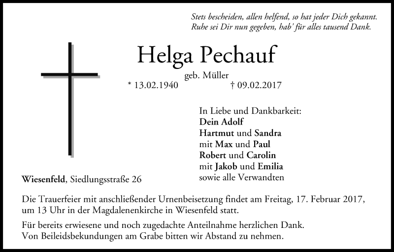 Hier finden Sie alle Traueranzeigen aus der Zeitung, die bisher für Helga Pechauf erschienen sind. Weitere Traueranzeigen, die in der Zeitung erscheinen, werden hier ebenfalls aufgelistet