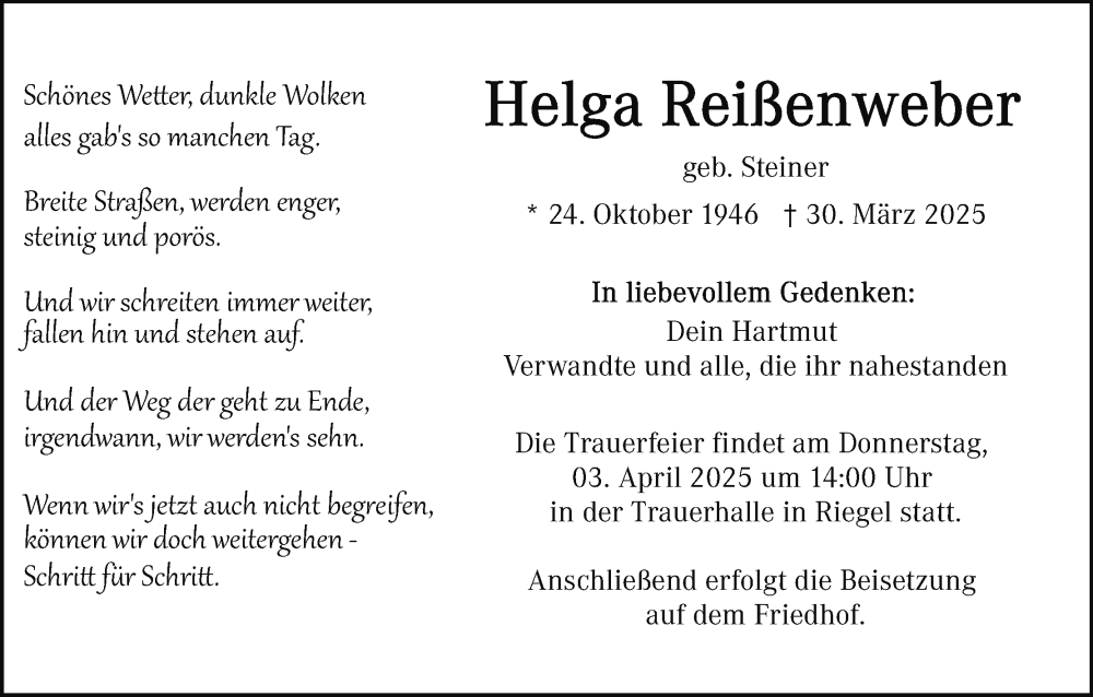 Hier finden Sie alle Traueranzeigen aus der Zeitung, die bisher für Helga Reißenweber erschienen sind. Weitere Traueranzeigen, die in der Zeitung erscheinen, werden hier ebenfalls aufgelistet