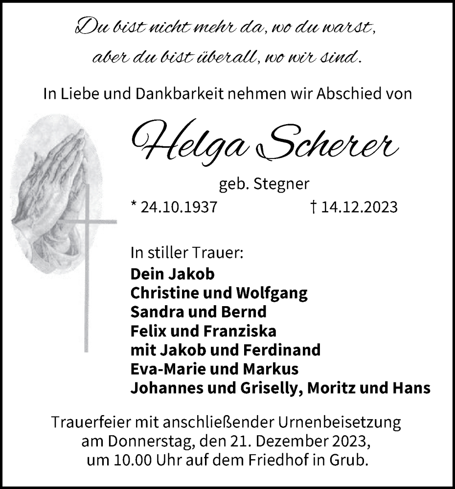 Hier finden Sie alle Traueranzeigen aus der Zeitung, die bisher für Helga Scherer erschienen sind. Weitere Traueranzeigen, die in der Zeitung erscheinen, werden hier ebenfalls aufgelistet