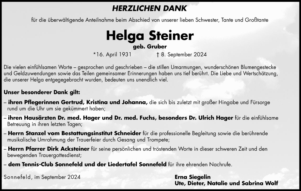 Hier finden Sie alle Traueranzeigen aus der Zeitung, die bisher für Helga Steiner erschienen sind. Weitere Traueranzeigen, die in der Zeitung erscheinen, werden hier ebenfalls aufgelistet