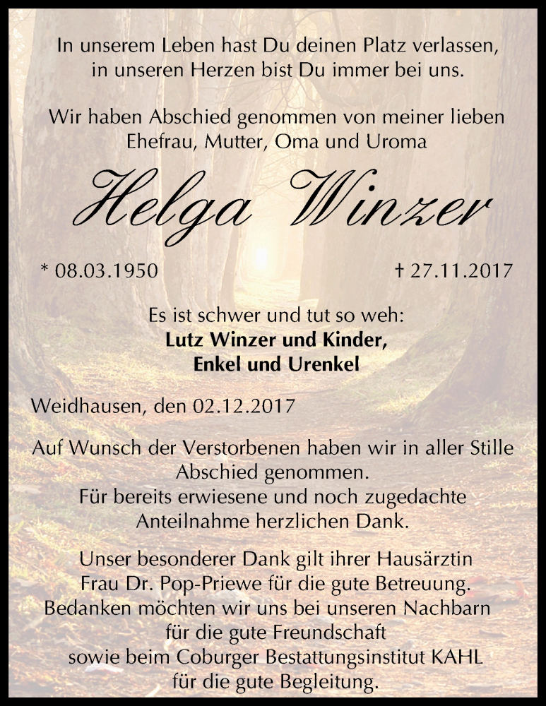 Hier finden Sie alle Traueranzeigen aus der Zeitung, die bisher für Helga Winzer erschienen sind. Weitere Traueranzeigen, die in der Zeitung erscheinen, werden hier ebenfalls aufgelistet