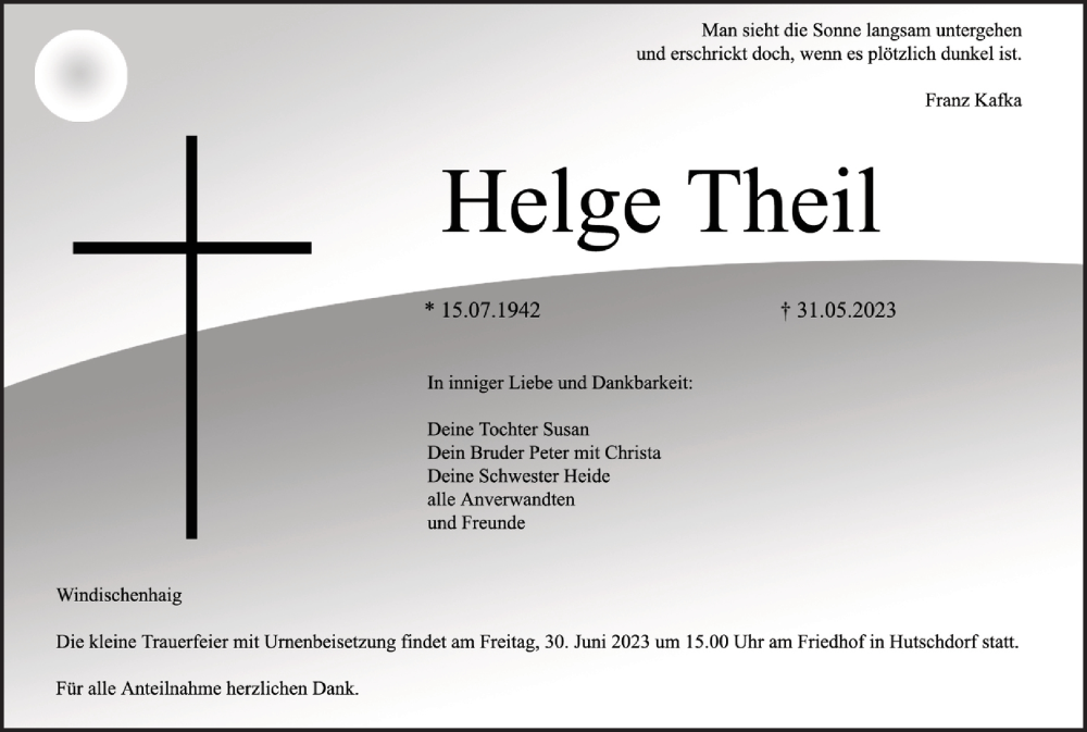 Hier finden Sie alle Traueranzeigen aus der Zeitung, die bisher für Helge Theil erschienen sind. Weitere Traueranzeigen, die in der Zeitung erscheinen, werden hier ebenfalls aufgelistet